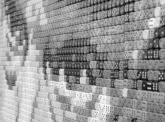 Ohh... Lucky You is a series that draws heavily on the aesthetics of the first art work to take advantage of digital technology in the late sixties. In these pioneering works, rudimentary dot matrix printers using typographical symbols form images that, when viewed at a certain distance, give the impression of a tonal gradation. In Ohh... Lucky You, the dice and their different facets with gray tones play a similar function. The low resolution of the works, far removed from what today would be considered "adequate", takes us back to a past which, although relatively close to us in time, is technologically very distant. The considerable size of the mosaics highlights the lack of definition.