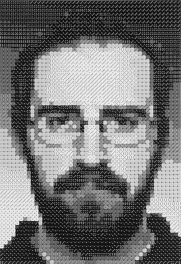 The series also showcases one of the central ideas in my recent work, highlighting the importance of understanding technical intricacies in order to avoid making innocent use of them, while at the same time remaining aware that there is always an ideological aim behind the design. Implicit in the evolution of technical images, there is a game of concealment that frequently is confused with a false sense of transparency. While approaching the mosaic, the viewer receives no further information from the image. Instead, it fades into an abstract accumulation of dice, which requires the viewer to ponder the technique that formed it.